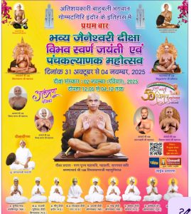 इंदौर। तीर्थ स्वरूप दिगंबर जैन आदिनाथ जिनालय छत्रपति नगर में निर्मित 45 फुट ऊतुंग सुदर्शनीय मानस्तभ में विराजित चतुर्मुखी 12 प्रभु प्रतिमाओं का परम पूज्य आचार्य द्वय विद्या- समय सागरजी महाराज के आशीर्वाद से एवं पूज्य मुनि द्वय श्री विमल सागर जी सागर जी एवं पूज्य मुनि श्री अनंत सागर जी महाराज के पावन सानिध्य…