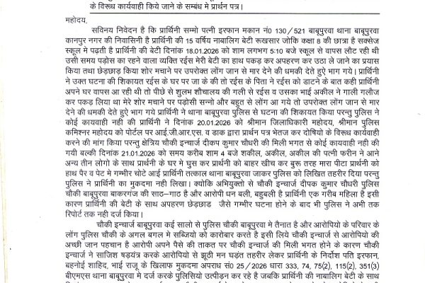 कानपुर -बाबू पुरवा थाना क्षेत्र में दिनांक 18 जनवरी 2026 को शाम लगभग 5:00 बजे एक स्कूल से पढ़ाई करके घर वापस आ रही 15 वर्षीय नाबालिक छात्रा के साथ आरोपियों ने छेड़छाड़ किया और अपहरण करने का प्रयास किया छात्रा के शोर मचाने पर आरोपी भाग गएआरोपियों के घर जब पीड़ित छात्रा के परिजन…