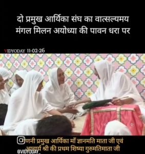 इंदौर- “अयोध्या” में श्रेष्ठ गणनी आर्यिका ज्ञानमती माताजी का ज्येष्ठ आर्यिका गुरुमति माताजी,दृण मति माताजी का भव्य मंगल मिलन” श्रंमण संस्कृति के समाधीष्ठ। संत शिरोमणि आचार्य गुरुदेव श्री विद्यासागरजीमहामुनिराज की प्रथम शिष्या ज्येष्ठ श्रैष्ठ आर्यिका रत्न गुरुमतिमाताजी, ज्येष्ठ श्रैष्ठ आर्यिका दृणमतिमाताजी,आर्यिका गुणमतिमाताजी स संघ सहित सभी 54 पिच्छीधारिओं का विशाल समूह तीर्थराज श्रीसम्मेदशिखर जी से…