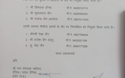 इंदौर, 22 फरवरी 2026: दिगंबर जैन समाज (सामाजिक संसद) इंदौर के आगामी 15 मार्च को होने वाले त्रिवर्षीय चुनाव को सुव्यवस्थित रूप से संपन्न कराने के लिए मुख्य चुनाव अधिकारी नरेंद्र कुमार जैन ने समन्वय हेतु समाज के तीन वरिष्ठ श्रेणीजन की नियुक्ति की है। जारी आदेश के अनुसार कार्यवाहक अध्यक्ष दिलीप पाटनी की अनुशंसा…