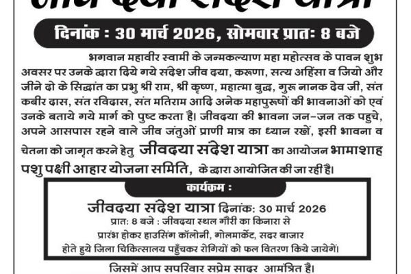 भगवान महावीर स्वामी जी के 2626 वा जन्मकल्याणक महोत्सव के उपलक्ष्य में सेवा भारती की प्रेरणा से भगवान महावीर द्वारा दिए गए संदेश जीवदया, करुणा, सत्य, अहिंसा एव जियो ओर जीने दो के सिद्धांत का प्रभु श्री राम, भगवान श्री कृष्ण, महात्मा बुद्ध, गुरुनायक देव, संत कबीरदास, संत रविदास, संत मतिराम आदि अनेकों महापुरुषों की…