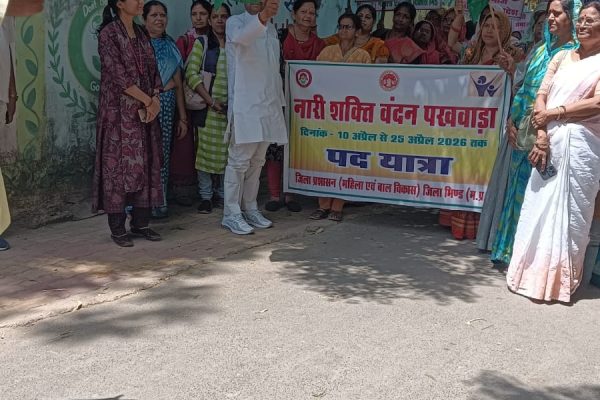 भिण्ड 15 अप्रैल 2026/ महिला एवं बाल विकास विभाग भिण्ड द्वारा नारी शक्ति वंदन पखवाड़ा कार्यक्रम के तहत् पदयात्रा का आयोजन किया गया। भाजपा जिलाध्यक्ष श्री देवेन्द्र सिंह नरवरिया ने पदयात्रा को हरी झंडी दिखाकर रवाना किया। पदयात्रा शासकीय उत्कृष्ट उच्चतर माध्यमिक विद्यालय क्रमांक-01 भिण्ड से प्रारंभ होकर अग्रसेन चौराहे भिण्ड पर समापन हुआ। पदयात्रा…