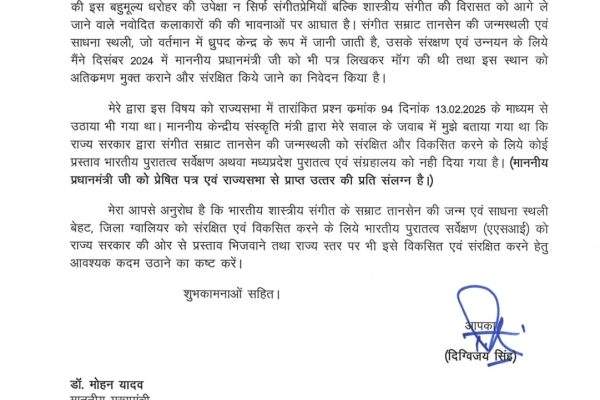 संगीत सम्राट तानसेन की जन्मस्थली बेहट के संरक्षण हेतु मुख्यमंत्री को पूर्व सीएम दिग्विजय सिंह का पत्र