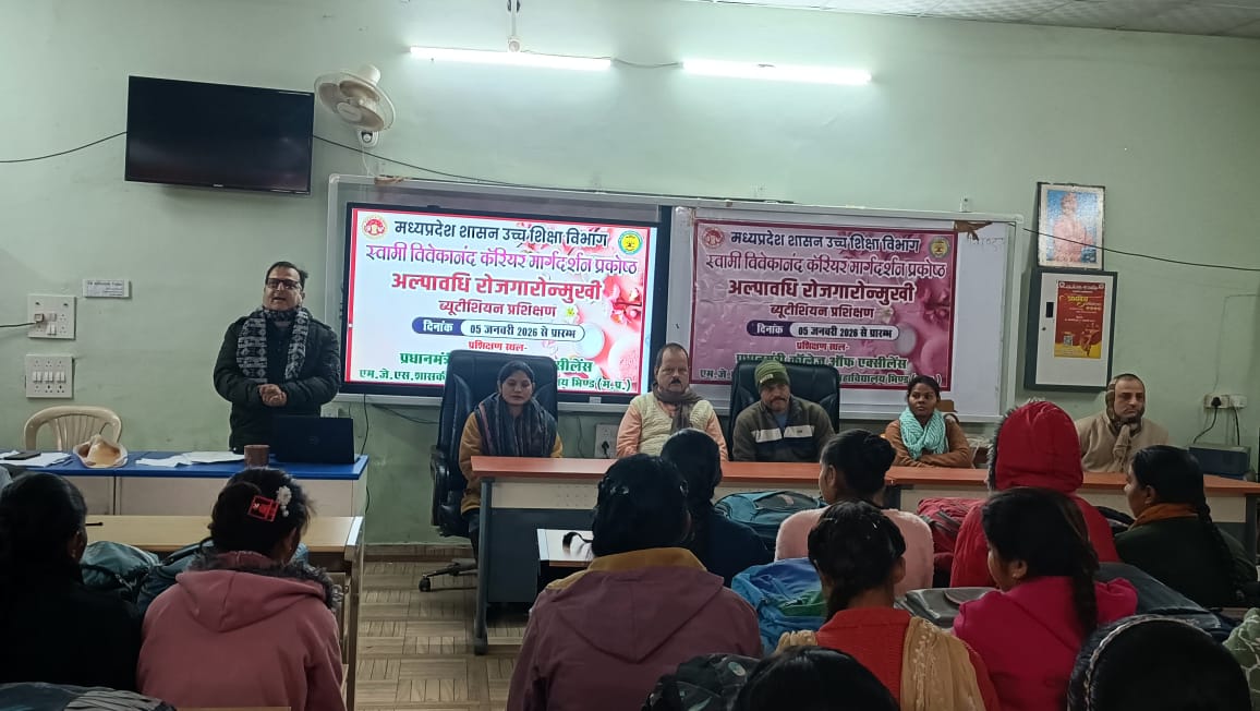 भिण्ड 05 जनवरी 2026/ प्रधानमंत्री कॉलेज ऑफ़ एक्सीलेंस शासकीय एम जे एस स्नातकोतर महाविद्यालय भिंड में स्वामी विवेकानंद कैरियर मार्गदर्शन प्रकोष्ठ के अंतर्गत मध्य प्रदेश और शिक्षा विभाग के दिशा निर्देश में अल्प अवधि रोजगार प्रशिक्षण कोर्स के अंतर्गत महाविद्यालय छात्रों के प्रशिक्षण हेतु ब्यूटीशियन कोर्स का प्रशिक्षण का शुभारंभ आज दिनांक 5 जनवरी 2026 को किया गया। इस अवसर पर महाविद्यालय प्राचार्य डॉ आर.ए.शर्मा ने सभी छात्रों को प्रशिक्षण में भाग लेने की शुभकामनाएं दी और नियमित रूप से प्रशिक्षण पूर्ण करने के लिए आग्रह किया उन्होंने बताया ब्यूटीशियन एक ऐसा प्रशिक्षण है जिसके माध्यम से सभी छात्राएं स्वरोजगार प्राप्त कर सकती है और आत्मनिर्भर बन सकती है विकसित भारत के नेतृत्व यह एक नींव के पत्थर के समान है। स्वामी विवेकानंद कैरियर मार्गदर्शन प्रकोष्ठ के प्रभारी प्रो मोहित कुमार दुबे ने सभी विद्यार्थियों को नियमित रूप से ब्यूटीशियन कोर्स करने के लिए आग्रह दिया उन्होंने कहा कि ब्यूटीशियन प्रशिक्षण स्वरोजगार के लिए एक बेहतरीन विकल्प है, जो महिलाओं और युवाओं को आत्मनिर्भर बनाता है, जिससे वे अपना ब्यूटी पार्लर खोल सकती हैं, फ्रीलांसर बन सकती हैं, या सैलून में काम कर सकती हैं। डॉ हेमंत दुबे ने बताया यह करियर न केवल आय का स्रोत है, बल्कि आत्मविश्वास और सामाजिक सम्मान भी बढ़ाता है, खासकर ग्रामीण और आर्थिक रूप से कमजोर महिलाओं के लिए। महाविद्यालय में ब्यूटीशियन प्रशिक्षण में लगभग 75 से 80 छात्राओं ने भाग लिया यह छात्राएं नियमित रूप से एक माह तक ब्यूटीशियन प्रशिक्षण का कोर्स कंप्लीट करेंगे प्रशिक्षण उपरांत इन्हें प्रमाण पत्र कर सम्मानित किया जाएगा और आत्मनिर्भर भारत के विकास में एक कदम आगे बढ़ाएंगी। इस अवसर पर समस्त महाविद्यालय स्टाफ उपस्थित रहा।