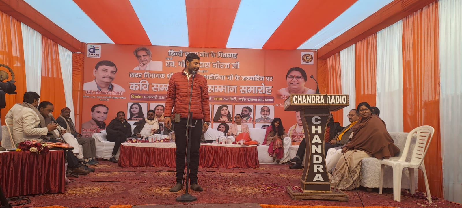 इटावा -गुंडे और मवाली जिनके नाम से ही थर्राते हैं और भौंकने वाले चुप हैं बिल्कुल ना गुर्राते हैं भू माफियाओं के अंदर खोफ है इतना भर डाला शांत सुरक्षित प्रगतिशील भय मुक्त इटावा कर डाला लगता है दुष्टो को हराने खुद जगदंबा आई हो या भदोरिया कुल में जन्मी स्वयं लक्ष्मी बाई हो ओजस कवि बृजेंद्र प्रताप सिंह ने सदर विधायक सरिता भदोरिया के आवास पर महाकवि गोपाल दास नीरज की स्मृति में अमेज फाउंडेशन द्वारा आयोजित विशाल कवि सम्मेलन में कविता पाठ करते हुए कहे।कवि सम्मेलन की अध्यक्षता इंजीनियर हरकिशोर तिवारी ने की मुख्य अतिथि के रूप में सदर विधायक सरिता भदोरिया कार्यक्रम संयोजक राघवेंद्र द्विवेदी ने सभी का आभार व्यक्त किया कार्यक्रम का संचालन कभी रोहित चौधरी ने किया कवि सम्मेलन में प्रमुख रूप से भारतीय जनता पार्टी क्षेत्रीय उपाध्यक्ष शिव महेश दुबे जिला अध्यक्ष अरुण कुमार अन्नू गुप्तापूर्व जिला अध्यक्ष अजय ठाकरे जिला महामंत्री शिवाकांत चौधरी जिला कोषाध्यक्ष संजू भदोरिया बार एसोसिएशन के अध्यक्ष राजेश त्रिपाठी एडवोकेट अश्वनी सिंह चौहान ब्राह्मण महासभा के अध्यक्ष अरुणदुबे बेस्ट महासम्मेलन के प्रदेश उपाध्यक्ष मनोज गुप्ता उत्तर प्रदेश उद्योग व्यापार प्रतिनिधि मंडल के प्रदेश वरिष्ठ उपाध्यक्ष एमपी सिंह तोमर रामशरण गुप्ता प्रदेश उपाध्यक्ष ओम रतन कश्यप नवर्तमान मंडल अध्यक्ष विवेक गुप्ता युवा मोर्चा के जिला अध्यक्ष संजू चौधरी कृपा नारायण तिवारीसमीर दोहर मंडल अध्यक्ष प्रमोद राठौड़ नया शहर मंडल अध्यक्ष चंदन मिश्रा मंडल अध्यक्ष एकदिल अभिषेक तिवारी बसरेहर मंडल अध्यक्ष सोनू बघेल अनुग्रह सेंगर अशोक चौहान टीटू व्यापारी नेता अनंत अग्रवाल चंदन पोरवाल व्यापारी नेता धर्मेंद्र जैन व्यापार मंडल की महिला जिला अध्यक्ष गुड्डी बाजपेई महिला अध्यक्ष अर्चना कुशवाहा नीतू नारायण मिश्रा रेनू भदोरिया आराधना जाटव प्रशांत दीक्षित प्रभाकर मिश्रा रवि किशन कश्यप अतुल पचौरी पंकज पचौरी अतिंद्र तिवारी प्रवीण तिवारी करण श्रीवास्तव राकेश पाल जोधा सिंह पाल बेंज सिंह पाल आदि प्रमुख रूप सेउपस्थित रहे