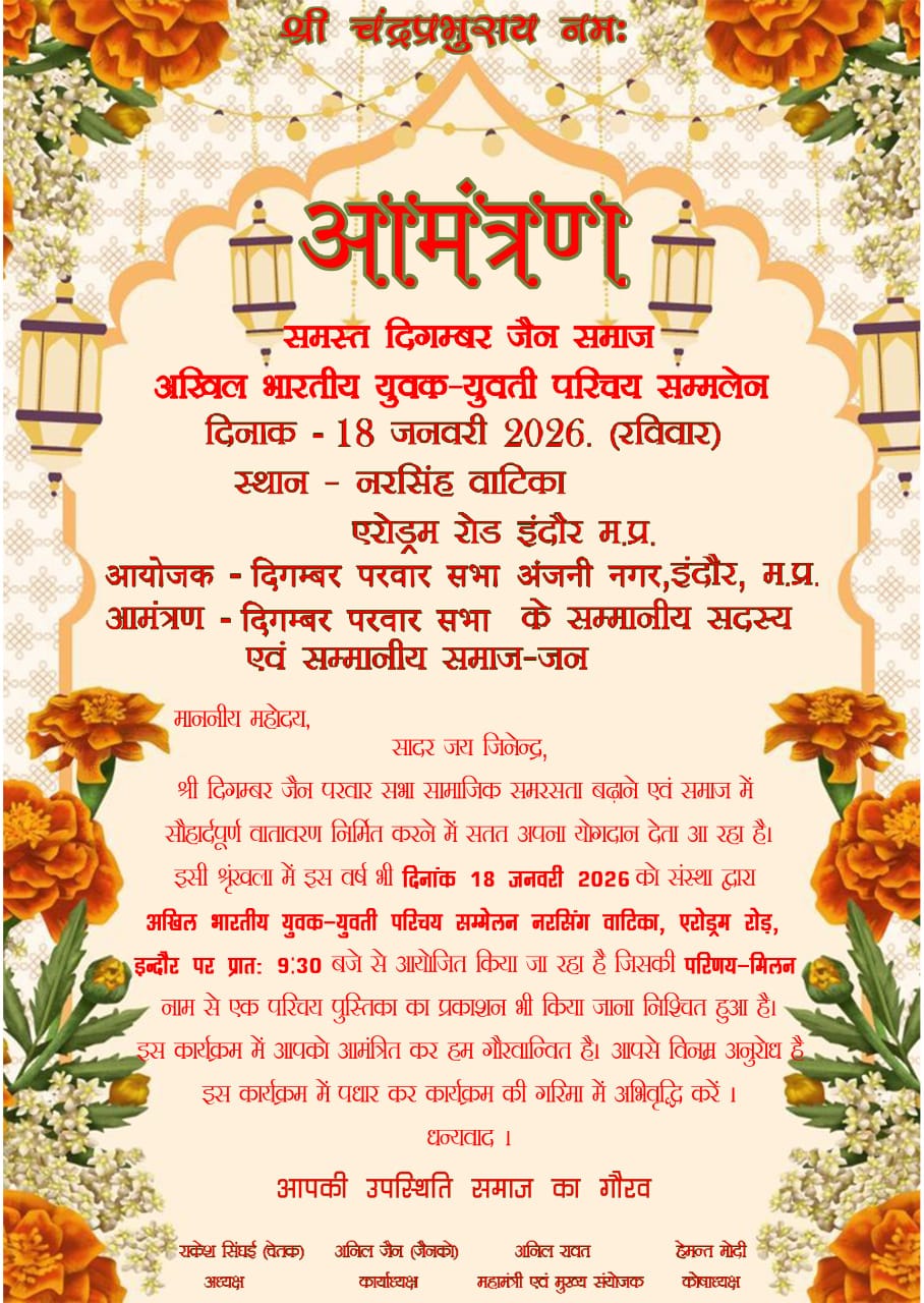 इंदौर-दिगंबर जैन परवार सभा का 25 वां अखिल भारतीय युवक युवती परिचय सम्मेलन रविवार 18 जनवरी को नरसिंह वाटिका ऐरोड्रम रोड पर होगा। सम्मेलन में स्थानीय,बाहर के एवं विदेशों से भी विवाह योग्य लगभग 900 प्रत्याशी के वायोडाटा के साथ सम्मेलन के प्रमुख संयोजक अनिल रावत के संपादकत्व में एक परिचय पुस्तिका परिणय मिलन का प्रकाशन भी किया गया है जिसका विमोचन सम्मेलन मे मुख्य अतिथि मंत्री कैलाश विजयवर्गी, सांसद शंकर लालवानी, महापौर पुष्प पुष्पमित्र भार्गव, विधायक शैलेंद्र जैन सागर के द्वारा किया जाएगा ।