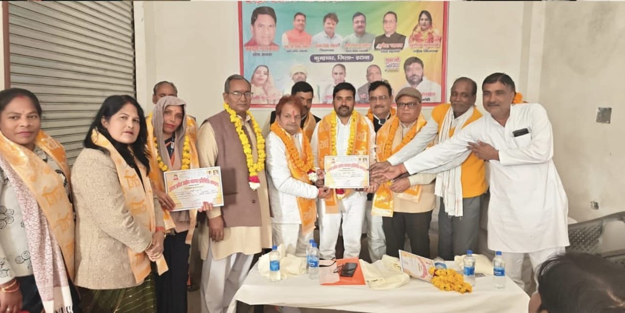 इटावा-उत्तर प्रदेश उद्योग व्यापार प्रतिनिधि मंडल कुम्हावर की बैठक राजन श्री मार्केट सैफई रोड कुम्हावर में सैकड़ो व्यापारियों की उपस्थिति में संपन्न हुई बैठक का आयोजन मुनीम सिंह यादव ने किया बैठक में जिला अध्यक्ष संतोष चौहान ने मुनीम सिंह यादव को कुम्हावर का उपाध्यक्ष बनाया जादौ सिंह यादव को संगठन मंत्री संदेश यादव को मंत्री साथ ही रूबी कुमारी को महिला व्यापार मंडल का जिला उपाध्यक्ष बनाया गया कुम्हावर टीम विस्तार में जिला महामंत्री रमेश यादव एवं जिला मंत्री अनिल यादव का सराहनीय योगदान रहा बैठक को संबोधित करते हुए जिला अध्यक्ष संतोष चौहान ने कुम्हावर के व्यापारियों को भरोसा दिलाया कि किसी भी व्यापारियों का उत्पीड़न कतई बर्दाश्त नहीं किया जाएगा उन्होंने व्यापारी समाज के लिए किए गए कार्यों के लिए मुख्यमंत्री योगी आदित्यनाथ की जमकर तारीफ की उन्होंने कहा कि किसी भी व्यापारी की कोई समस्या हो तो वह लिखित में जिला कार्यालय नुमाइश चौराहा इटावा पर भेजें ताकि उसका संबंधित अधिकारी से निस्तारण कराया जा सके कार्यक्रम में जिला अध्यक्ष संतोष चौहान जिला वरिष्ठ महामंत्री हरि गोपाल शुक्ला जिला महामंत्री रमेश यादव उद्योग मंच जिला अध्यक्ष मेजर पांडे महिला जिला अध्यक्ष सुनीता कुशवाहा जिला मंत्री अनिल यादव महिला उपाध्यक्ष मिथलेश कुशवाहा कुम्हावर अध्यक्ष डॉक्टर काले खान मंसूरी महामंत्री वीरेंद्र शुक्ला कुम्हावर कोषाध्यक्ष ज्योति शंकर राठौर सोहेल खान अरुण यादव आलोक कुमार मिलाप सिंह पंकज कुमार प्रजापति मोहित पाल आदि प्रमुख पदाधिकारी उपस्थित थे
