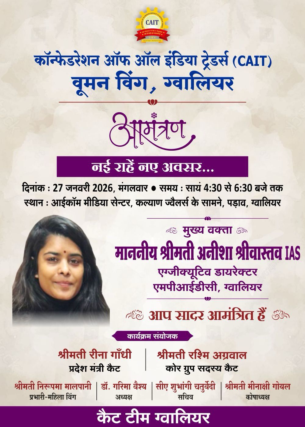कॉन्फेडरेशन ऑफ ऑल इंडिया ट्रेडर्स (कैट) महिला विंग द्वारा महिला उद्यमियों के लिए ‘‘नई राहें नये अवसर’’ कार्यक्रम का द्वितीय चरण 27 जनवरी 2026 को सायंकाल 4.30 बजे आईकोम मीडिया सेन्टर, कल्याण ज्वैलर्स के सामने, पड़ाव, ग्वालियर पर आयोजित किया गया है। कैट की प्रदेश मंत्री रीना गांधी एवं कोर ग्रुप सदस्य रश्मि अग्रवाल ने बताया कि आईआईडीसी की एक्जीक्यूटिव डायरेक्टर अनिशा श्रीवास्तव आईएएस मुख्य अतिथि के रूप में उपस्थित रहेंगी। कार्यक्रम में ग्वालियर में निर्माण किये जा रहे नवीन औद्योगिक केन्द्रों पर चर्चा होगी एवं महिला उद्यमियों को नये उद्योग स्थापित करने में किस प्रकार म.प्र. सरकार की योजनाओं का लाभ दिला सकते हैं, इसकी जानकारी अनिशा श्रीवास्तव एक्जीक्यूटिव डायरेक्टर एमपीआईडीसी देंगी।