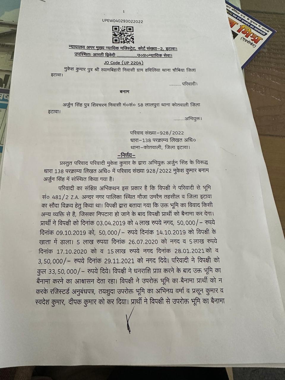 इटावा-विगत दिनों परिवाद संख्या – 928/ 2022, धारा 138 थाना कोतवाली जिला इटावा के अंतर्गत विद्वान न्यायाधीश अपर न्यायिक मजिस्ट्रेट आरती द्विवेदी द्वारा विगत दिनों जनवरी माह में वादी मुकेश कुमार पुत्र श्याम बिहारी के पक्ष में निर्णय देते हुए अभियुक्त अर्जुन सिंह पुत्र शिवचरण निवासी मकान संख्या 58 लालपुर थाना कोतवाली जिला इटावा को दंडित करते हुए 1 वर्ष के साधारण कारावास की सजा तथा अंकन 50, 00,000/- रु० (50 लाख रुपए) लख रुपए अर्थ दंड के साथ दंडित किए जाने का निर्णय दिया गया ।