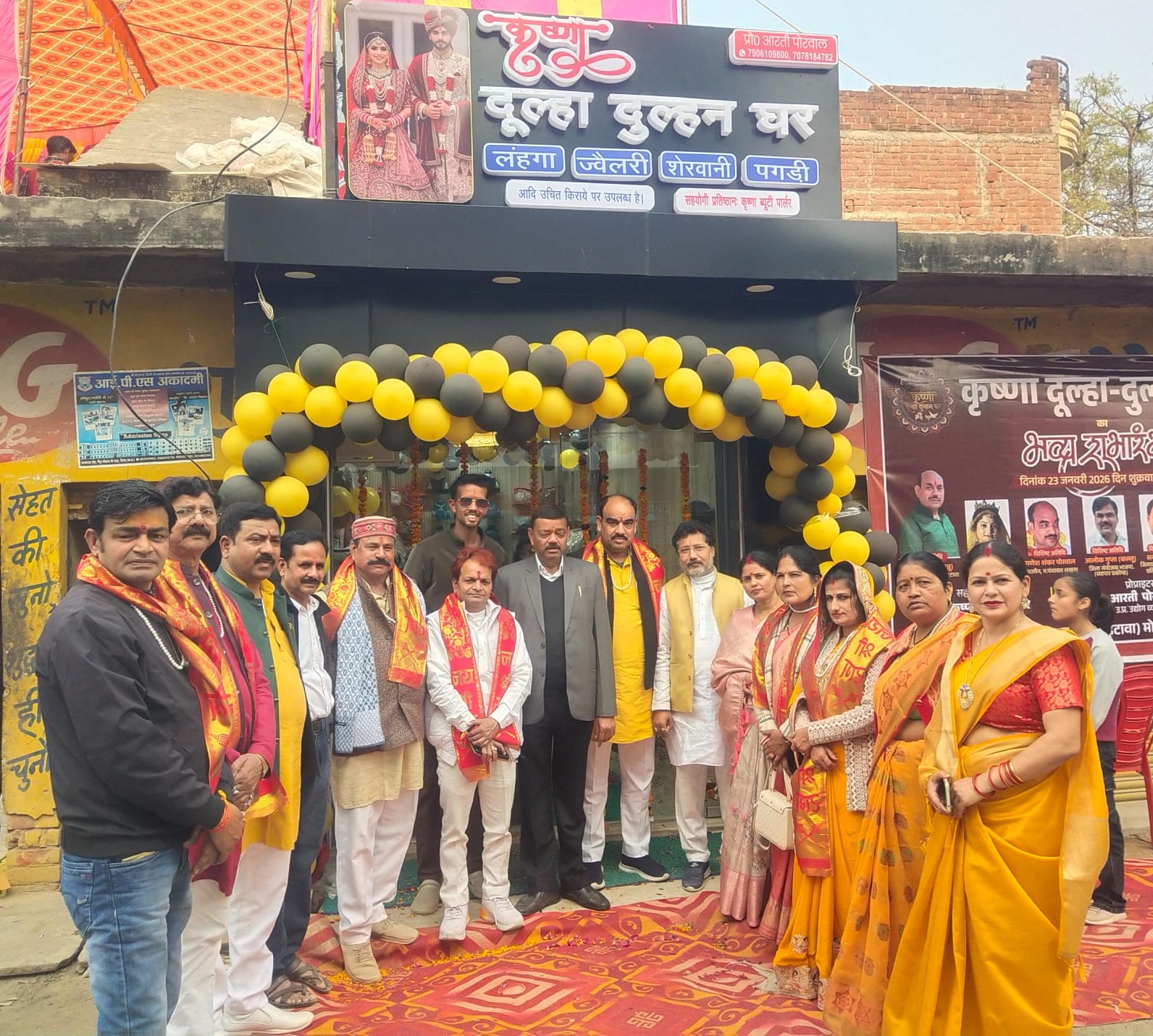 इटावा-उत्तर प्रदेश उद्योग व्यापार प्रतिनिधिमंडल लखना की महिला महामंत्री आरती पोरवाल के नवीन प्रतिष्ठान कृष्णा दूल्हा दुल्हन घर ईकरी रोड लखना के शुभारंभ कार्यक्रम में जिला अध्यक्ष संतोष चौहान अपने सम्मानित पदाधिकारियों जिला संरक्षक एवं भाजपा के जिला अध्यक्ष अरुण कुमार गुप्ता अन्नू भरथना के संरक्षक मनोज पोरवाल पूर्व अध्यक्ष लखना अध्यक्ष गणेश पोरवाल प्रदेश मंत्री विवेक पोरवाल जिला महामंत्री सुनीत चौहान जिला वरिष्ठ उपाध्यक्ष शिवकुमार सिंह चौहान जिला प्रभारी रवि पोरवाल उद्योग मंच जिला अध्यक्ष मेजर पांडे महिला जिला अध्यक्ष सुनीता कुशवाहा नगर अध्यक्ष ओम रतन कश्यप जिला उपाध्यक्ष अभिषेक दीक्षित यशवीर सिंह चौहान सुनील पोरवाल राजीव पाल युवा जिला अध्यक्ष अजय गुप्ता युवा जिला उपाध्यक्ष आलोक गुप्ता जिला मंत्री गिरीश शुक्ला भरथना अध्यक्ष प्रदीप पोरवाल रज्जन महिला पदाधिकारी कृष्णा राजपूत गुड़िया पोरवाल लखना के पूर्व अध्यक्ष संतोष राठौर सहित अन्य पदाधिकारी उपस्थित थे कृष्णा दूल्हा दुल्हन घर के मालिक आरती पोरवाल एवं शिवकुमार पोरवाल ने व्यापार मंडल के पदाधिकारियों का फूल मालाओं एवं अंग वस्त्र पहनाकर प्रतीक चिन्ह देकर स्वागत किया ।