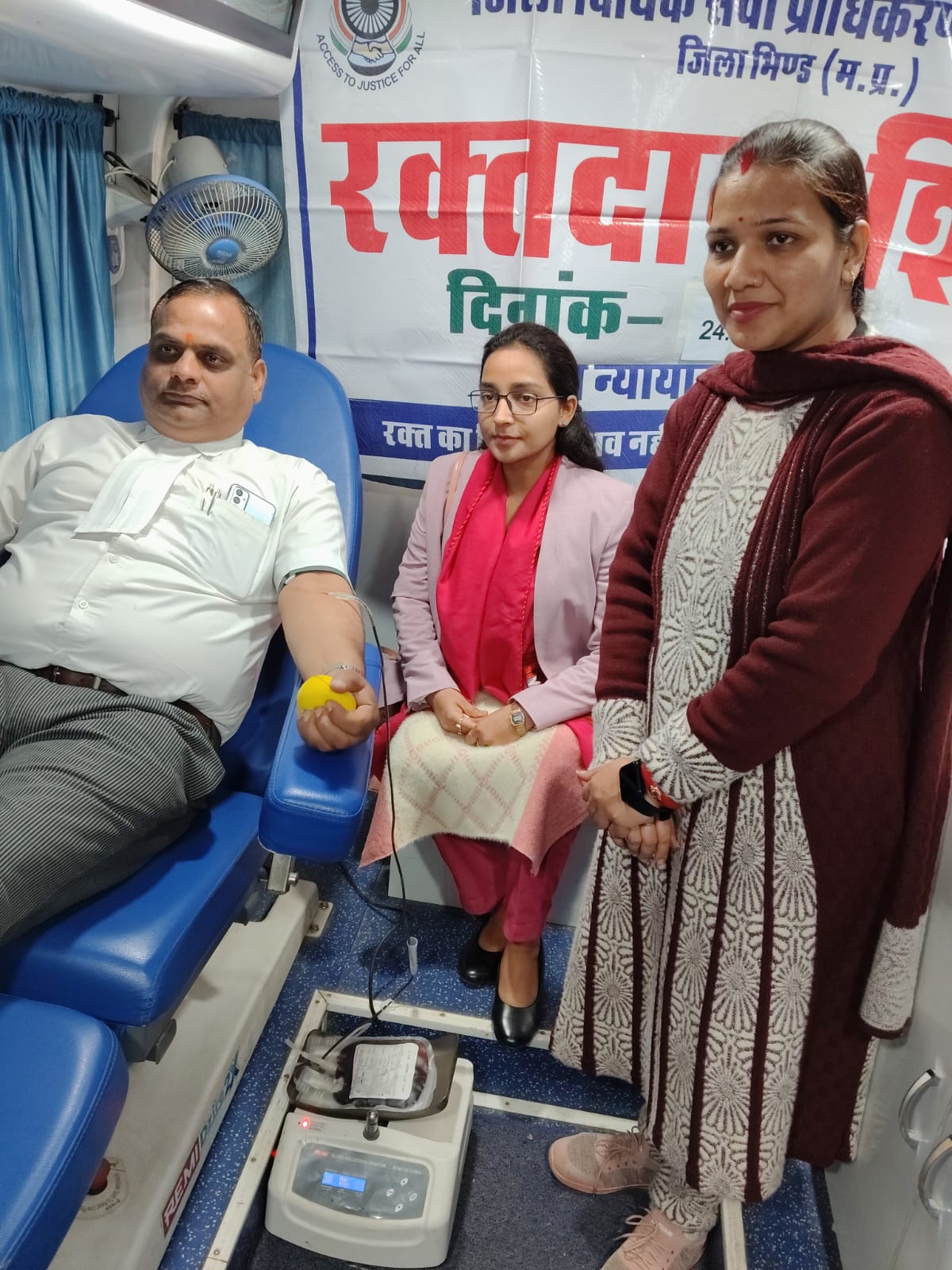 मान. राज्य विधिक सेवा प्राधिकरण, जबलपुर की प्रेरणा से अध्यक्ष /प्रधान जिला न्यायाधीश श्री के.एस.बारिया के नेतृत्व में एवं सुश्री अनुभूति गुप्ता, न्यायाधीश/सचिव जिला विधिक सेवा प्राधिकरण, भिण्ड की उपस्थिति में मुख्य चिकित्सा एवं स्वास्थ्य अधिकारी, भिण्ड के समन्वय से जिला भिण्ड में रक्त समुचित मात्रा में जरूरतमंदों को समय पर उपलब्ध कराने के उद्देश्य से जिला न्यायालय परिसर, भिण्ड में रक्तदान शिविर का आयोजन किया गया एवं साथ ही स्वास्थ्य को ध्यान में रखते हुए स्वास्थ्य परीक्षण शिविर का आयोजन किया गया, जिसमें न्यायाधीशगण, अधिकारीगण, अधिवक्तागण, न्यायालय के कर्मचारीगण आदि द्वारा अपना स्वास्थ्य परीक्षण करवाया गया।