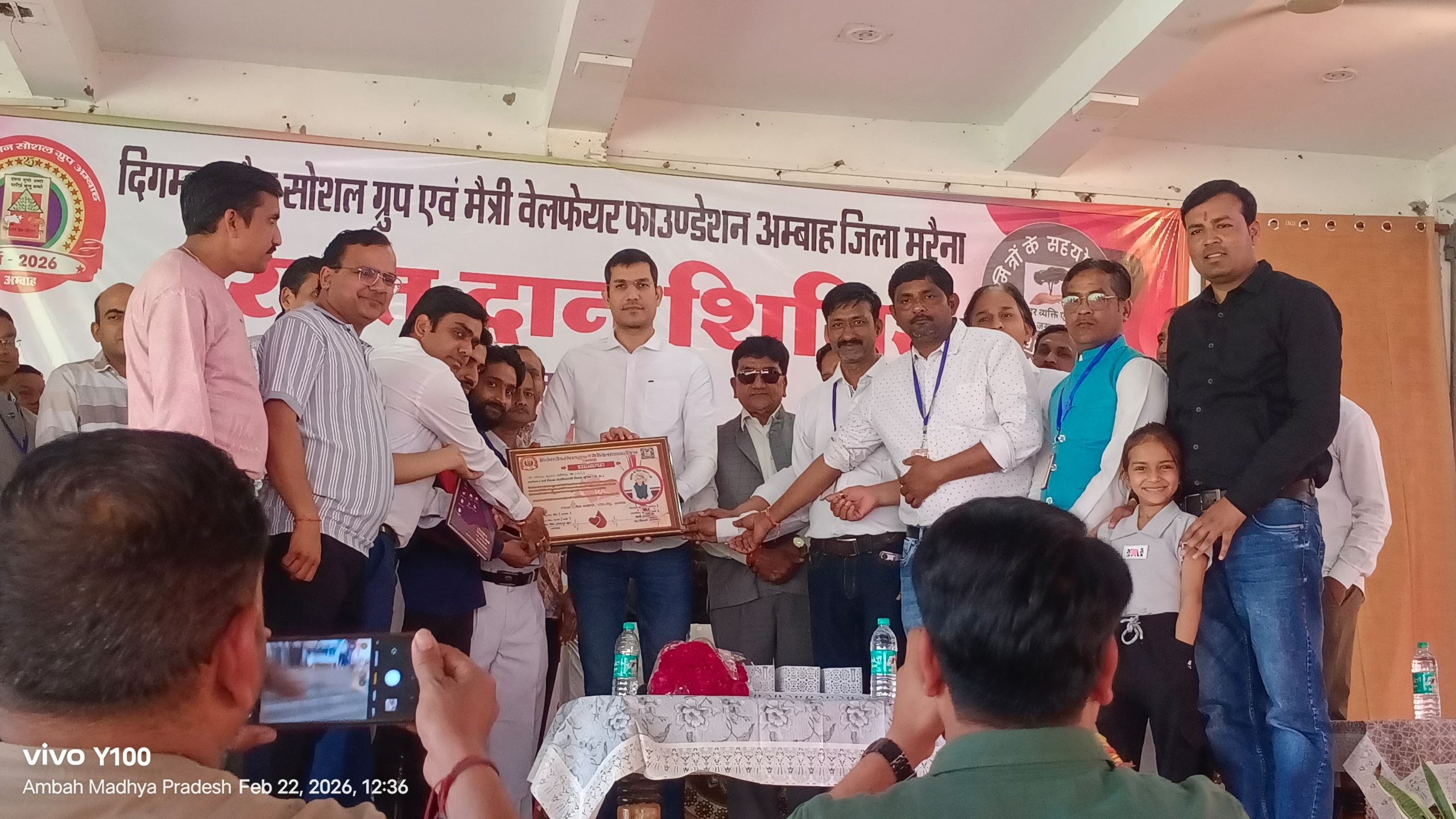 मैत्री वेलफेयर फाउंडेशन एवं दिगंबर जैन सोशल ग्रुप के संयुक्त तत्वाधान में रक्तदान शिविर का आयोजन किया गया । शिविर में मुख्य अतिथि के रूप में जिला दंडाधिकारी लोकेश कुमार जांगिड़ (कलेक्टर मुरैना) सम्मिलित हुए । उन्होंने स्वयं भी रक्तदान किया ।