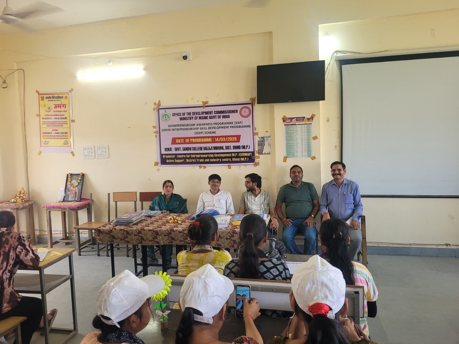 भिण्ड 15 मार्च 2026/ एक दिवसीय निःशुल्क उद्यमिता जागरूकता शिविर का आयोजन ’शासकीय गांधी महाविद्यालय बालाजी मोहना में आयोजित किया गया ।इस कार्यक्रम में मुख्य अतिथि महाविद्यालय के प्राचार्य श्री धर्म सिंह, डॉ संजय शुक्ला,डॉक्टर अजय द्विवेदी अभिषेक तिवारी डॉक्टर कृष्णकांत एवं आशीष जैन आदि के आतिथ्य में आयोजित किया गया।