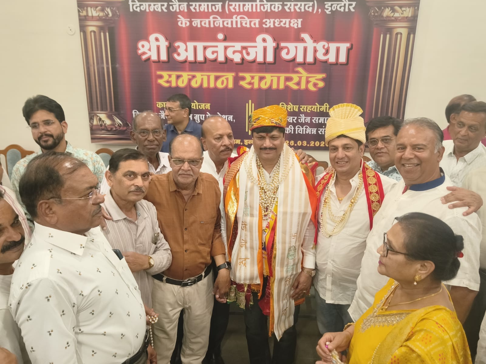 इंदौर। दिगंबर जैन समाज सामाजिक संसद के नवनिर्वाचित अध्यक्ष आनंद गोधा का दिगंबर जैन सोशल ग्रुप फेडरेशन के तत्वावधान में आयोजित सम्मान समारोह में फेडरेशन सहित समाज की 65 संस्थाओं ने शाल श्रीफल, मोतियों की माला दुपट्टा और पगड़ी पहनकर का उनका सम्मान किया। उदासीन आश्रम स्थित कुंदकुंद ज्ञानपीठ परिसर के सभागृह में आयोजित समारोह में अपने सम्मान के प्रति आभार एवं मन की बात मन से करते हुए गोधा ने कहा कि मैं मान, सम्मान और अभिमान के लिए अध्यक्ष नहीं बना हूं मेरी जीत आप सब की जीत है। आप सब ने मुझे सामाजिक संसद का अध्यक्ष बनाकर पूरी समाज को एक करने का जो दायित्व मुझे सोंपा है उसे आप सब के सहयोग से पूरा करूंगा और ऐसा कोई कार्य नहीं करूंगा जिससे समाज की भावनाओं को या किसी के मान सम्मान को ठेस पहुंचे। समाज में एकता, समन्वयऔर सोहार्द बढ़े, एवं समाज के विकास को गति मिले अध्यक्ष के रूप में यह मेरी पहली प्राथमिकता होगी।