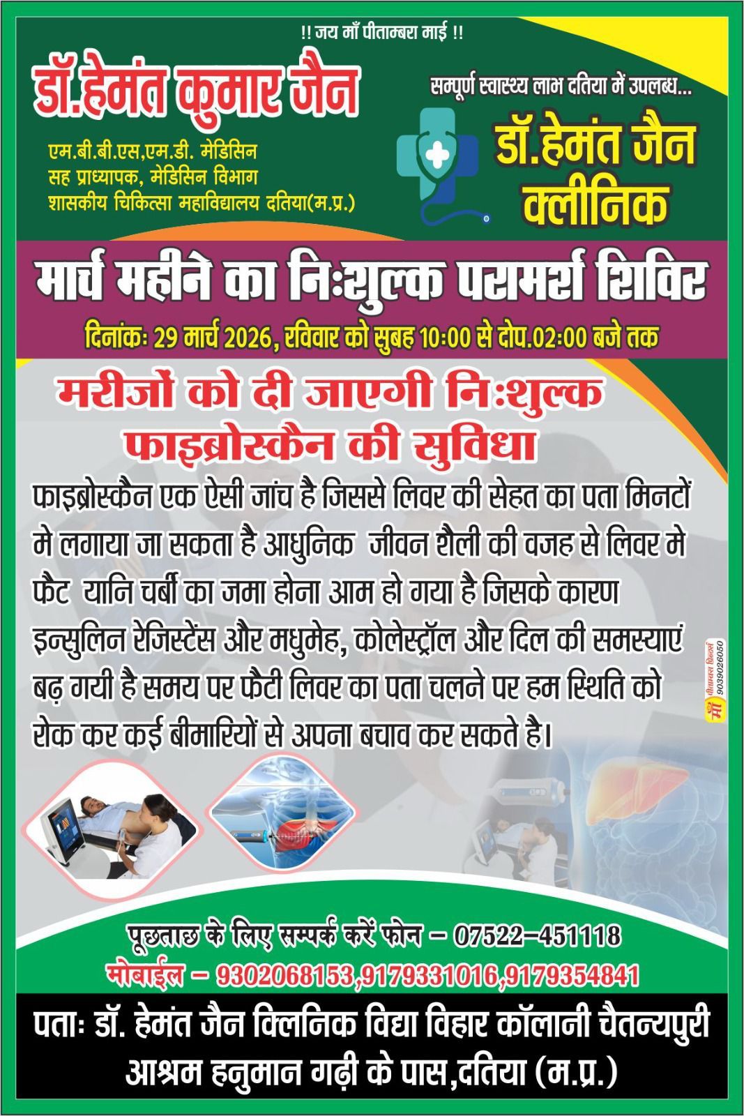 दतिया वासियों के लिए बड़ी खबर: डॉ. हेमंत कुमार जैन क्लिनिक पर लगेगा नि:शुल्क ‘फाइब्रोस्कैन’ शिविर