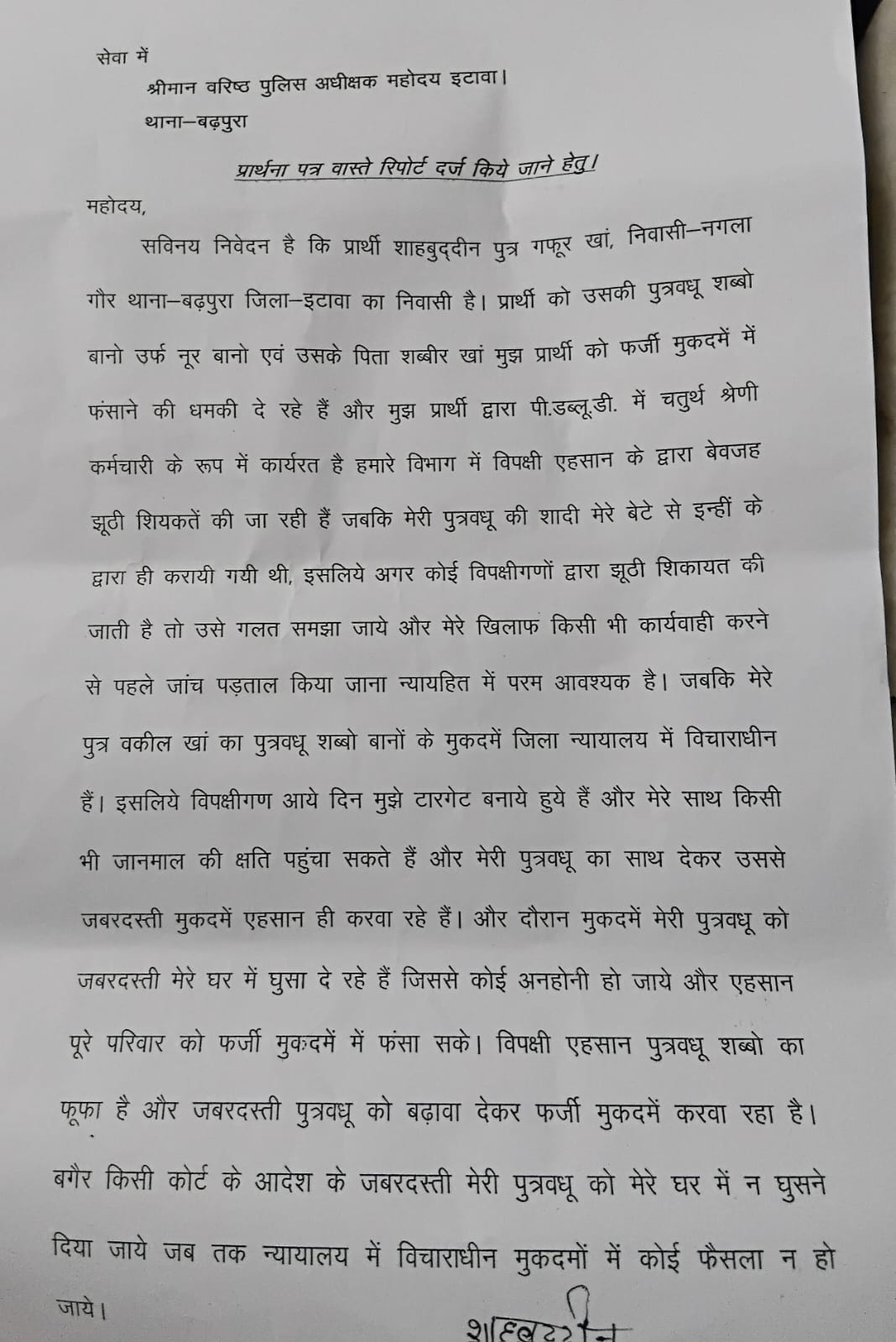 इटावा- थाना बढ़पुरा क्षेत्र के नगला गौर निवासी एक बुजुर्ग पिता ने अपनी ही पुत्रवधू और उसके परिवार द्वारा कथित रूप से फर्जी मुकदमों में फंसाए जाने और जानलेवा धमकियों की शिकायत की है। शाहबुद्दीन पुत्र गफूर खां ने शासन-प्रशासन से रक्षा की गुहार लगाते हुए बताया कि उनकी पुत्रवधू शब्बो बानो उर्फ नूर बानो और उसके पिता शब्बीर खां द्वारा उन्हें लगातार फर्जी मुकदमों में फंसाने की धमकियां दी जा रही हैंशाहबुद्दीन ने बताया कि वह वर्तमान में पीडब्लूडी में चतुर्थ श्रेणी कर्मचारी के रूप में कार्यरत हैं और उनके विरुद्ध विपक्षी एहसान द्वारा विभाग में झूठी शिकायतें की जा रही हैं। उन्होंने दावा किया कि उनकी पुत्रवधू की शादी उनके बेटे से इन्हीं के द्वारा कराई गई थी, लेकिन अब वही लोग उनके परिवार को परेशान कर रहे हैं।शाहबुद्दीन ने चौंकाने वाला खुलासा करते हुए बताया कि उनकी पुत्रवधू आए दिन धमकी देती है कि “तुम लोगों के घर आकर जहर खा लूंगी और तुम सबको फंसा दूंगी।” उन्होंने आरोप लगाया कि एहसान नामक व्यक्ति, जो कि पुत्रवधू का फूफा है, उसे बढ़ावा देकर फर्जी मुकदमे करवा रहा है।शिकायत में कहा गया है कि विपक्षी जानबूझकर पुत्रवधू को जबरदस्ती उनके घर में घुसा देते हैं ताकि कोई अनहोनी घटना कराकर पूरे परिवार को फर्जी मुकदमों में फंसाया जा सके। गौरतलब है कि शाहबुद्दीन के पुत्र वकील खां और पुत्रवधू शब्बो बानो के बीच विवादित मामला जिला न्यायालय में विचाराधीन है।शाहबुद्दीन ने मांग की है कि बिना किसी कोर्ट आदेश के उनकी पुत्रवधू को जबरदस्ती घर में न घुसने दिया जाए। उन्होंने शासन-प्रशासन से मदद की गुहार लगाते हुए कहा कि उनके और उनके परिवार की सुरक्षा सुनिश्चित की जाए और झूठे मुकदमों के खिलाफ कार्रवाई की जाए।इस बुजुर्ग पिता ने अंत में कहा कि उन्हें भारतीय न्याय प्रणाली पर पूरा भरोसा है और वे मानते हैं कि प्रशासन उन्हें न्याय दिलाएगा। उन्होंने कहा, “मैंने अपनी जिंदगी में कभी किसी का बुरा नहीं किया, अब बुढ़ापे में सिर्फ न्याय चाहता हूं।