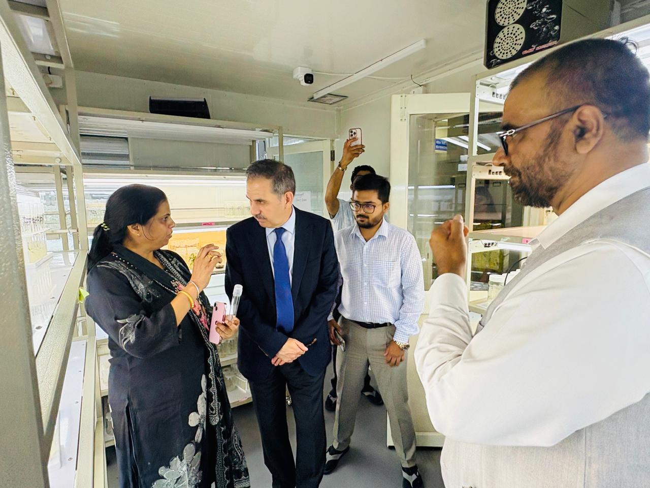 ग्वालियर, 28 सितम्बर 2025। जॉर्डन के राजदूत श्री यूसुफ अब्देलघानी ने आज राजमाता विजयाराजे सिंधिया कृषि विश्वविद्यालय, ग्वालियर का भ्रमण किया और माननीय कुलपति प्रो. अरविंद शुक्ला से भेंट की। इस अवसर पर उन्होंने विश्वविद्यालय की शोध एवं शैक्षणिक गतिविधियों की सराहना की। जॉर्डन के राजदूत सुबह साढ़े 11 बजे विश्वविद्यालय पहुँचे और डेढ़ घंटे दोपहर1 बजे तक परिसर में रुके तथा वहाँ चल रहे नवाचारों के बारे में सुक्ष्मता से जानकारी ली