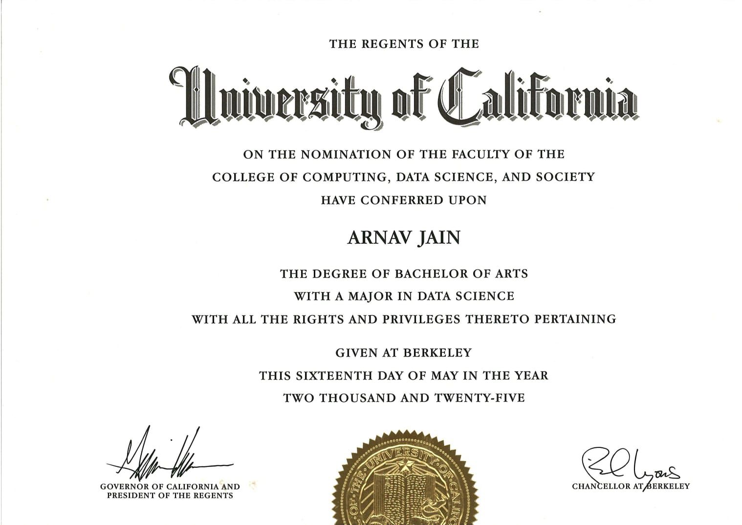 भारत के सुप्रसिद्ध उद्यमी, वरिष्ठ समाजसेवी, भाभाशाह प्रदीप जैन पीएनसी द्वारा प्रदत्त जानकारी के अनुसार मेरे भतीजे अरनव जैन सुपुत्र योगेश जैन को दो डिग्रियां University of California से प्राप्त हुई। अरनव जैन शुरू से ही मेधावी छात्र रहा और इसकी स्कूलिंग भारत के प्रसिद्ध Doon School देहरादून से हुई जहां पर अरनव टॉपर रहा। स्कूलिंग करने के बाद अरनव का एडमिशन Graduate Course के लिए University of California, America मैं हो गया। अरनव ने अपने लक्ष्य की प्राप्ति के लिए अटूट मेहनत की और अपने ज्ञान के बल पर एक साथ Two Major Degrees प्राप्त की।