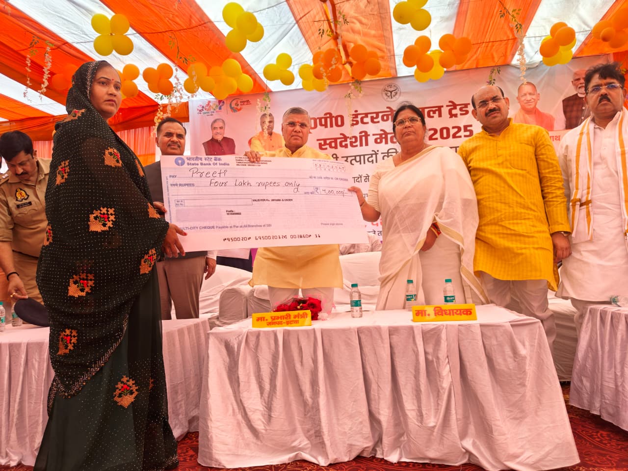 इटावा- यूपी इंटरनेशनल ट्रेड शो स्वदेशी मेला के अंतर्गत स्वदेशी उत्पादों की बिक्री व प्रदर्शिनी का उद्घाटन कार्यक्रम राज्यमंत्री स्वतंत्र प्रभार होमगार्ड्स, नागरिक सुरक्षा, प्रभारी मंत्री धर्मवीर प्रजापति, सदर विधायक सरिता भदौरिया की अध्यक्षता में राजकीय इंटर कॉलेज के खेल मैदान में आयोजित किया गया। मंत्री ने मां सरस्वती के चित्र पर माल्यार्पण एवं पुष्प अर्पित कर कार्यक्रम का शुभारम्भ किया गया। बालिका राजकीय इंटर कॉलेज की छात्राओं द्वारा सरस्वती वंदना प्रस्तुत की गई एवं अन्य सांस्कृतिक कार्यक्रम भी आयोजित किए गए। कार्यक्रम में उद्योग विभाग की विभिन्न योजनाओं में लोन लेने वाले लाभार्थियों को मंत्री ने चेक वितरण की गई।पर्यटन विभाग द्वारा आयोजित सेवा पखवाड़ा जूनियर, सीनियर व सामान्य वर्ग की चित्रकला प्रतियोगिता आयोजित की गई थी, जिसके विजेताओं को मंत्री द्वारा प्रथम विजेता को रू. 51000, द्वितीय विजेता को रू. 21000, तथा तृतीय विजेता को रू. 11000 की चेक वितरण की गई। सभी विभागों के स्टॉल लगाए गए, जिसका अवलोकन मंत्री द्वारा किया गया। कुल 50 स्टॉल लगाए गए हैं, जो कि 18 अक्टूबर तक संचालित रहेंगे, इसमें ज्यादा से ज्यादा लोग आएं और प्रदर्शिनी का लाभ उठाएं।