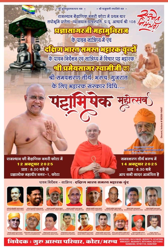 कोटा- राणा प्रताप मीरा पन्ना धाय के तप त्याग ओर साधना की पावन वसुंधरा राजस्थान प्रांत की शिक्षा की काशी औद्योगिक धर्मप्राण नगरी कोटा के महावीर नगर प्रथम स्थित प्रज्ञा लोक में आचार्य 108 प्रज्ञा सागर जी महाराज ससंघ का भव्य चातुर्मास हर्षौल्लास के मंगलमय वातावरण में एक से बढ़कर एक धार्मिक अनुष्ठानों के साथ सफलता के शिखर की ओर गतिमान है। ऐसे में एक ऐतिहासिक भव्य दुर्लभ पट्टाभिषेक महा महोत्सव का उत्तर भारत में भव्यातिभव्य अनुपम आयोजन प्रज्ञालोक में पहली बार होगा। इस आयोजन में दक्षिण भारत के समस्त भट्टारक स्वामी जी के निर्देशन एवं सानिध्य में विचार पट्ट भट्टारक श्री प्रमेय सागर जी स्वामी जी का श्री समवशरण तीर्थ भरूच गुजरात के लिए भट्टारक संस्कार विधि पट्टाभिषेक महोत्सव आचार्य श्री प्रज्ञा सागर जी महाराज के पावन सानिध्य में उनके वरद हस्त कर कमलों से किया जाएगा पट्टाभिषेक दिनांक 12 अक्टूबर 2025 को प्रायः 8 बजे आयोजित किया जाएगा। यह आयोजन गुरु आस्था परिवार कोटा एवं सकल दिगम्बर जैन समाज समिति के तत्वाधान में आयोजित होगा। इस अवसर पर सकल दिगंबर जैन समाज के परम संरक्षक राजमल पाटोदी विनोद जैन टोरडी विमल चन्द जैन नान्ता प्रकाश ठोरा अध्यक्ष प्रकाश बज महामंत्री पदम जैन बड़ला कोषाध्यक्ष जितेंद्र जैन हरसोरा कोषाध्यक्ष जे के जैन गुरु आस्था परिवार के अध्यक्ष यतिंद्र जी खेड़ा वाला अध्यक्ष लोकेश जैन सीसवाली महामंत्री नवीन जैन दौराया सहित समस्त पदाधिकारी उपस्थित रहेंगे। समस्त भारत वर्ष से श्रद्धालुगण इस आयोजन में उपस्थित होकर भव्यता प्रदान करेंगे। इस अवसर पर जगदीश जिंदल शैलेंद्र जैन पारस जैन भूपेंद्र जैन कपिल जैन आगम अर्पित जैन सौरभ जैन तारा चंद बड़ला ऋषभ जैन गोधा अंकित जैन पारस जैन “पार्श्वमणि” उपस्थित रहेंगे।