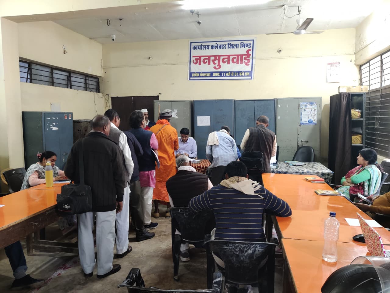 भिण्ड 25 नवम्बर 2025/ कलेक्टर भिण्ड ने कलेक्ट्रेट कार्यालय भिण्ड में आयोजित जनसुनवाई में जनसामान्य की शिकायतों को सुनकर उनके त्वरित, समयबद्ध व गुणवत्तापूर्ण निस्तारण के लिए संबंधित अधिकारियों को निर्देश दिए। इस मौके पर सीईओ जिला पंचायत भिण्ड एवं डिप्टी कलेक्टर द्वारा भी आवेदकों की समस्याओं पर जनसुनवाई की गई। जनसुनवाई के दौरान 83 से अधिक आवेदन आए जिन पर संबंधितों को भेजकर कार्यवाही के निर्देश दिए।